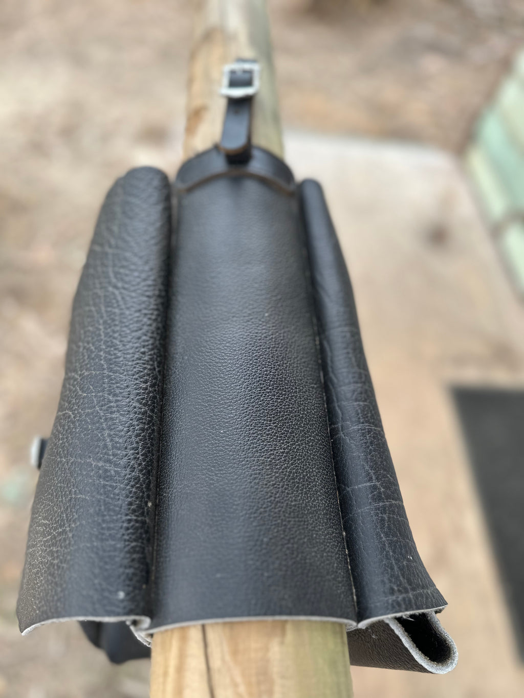 Custom made order that was not collected. Job value at $380, but selling for $150 to make space in the workshop. Made using genuine high quality soft black leather. Large pockets for plenty of storage. Attachment can be customised if needed to fit a specific bike.